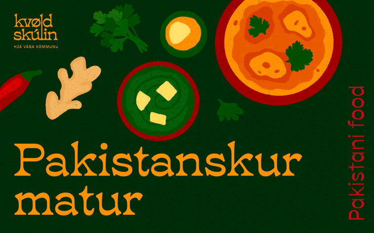 Kom og lær at gera mat frá Pakistan saman við Shakeel Jamil. Tú lærir stig fyri stig, hvussu tú gert pakistanskan gøtumat so sum samosas, myntuchutney og royktar auberginir. Tú fært kryddurtir úr Útnorðurpakistan við heim aftan á skeiðið. Vit hittast eitt kvøld.